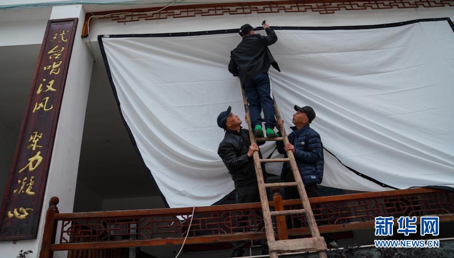 12月2日,马俊寿(右)和同事一起在黎川县华山镇悬挂电影幕布。新华社记者 胡晨欢 摄