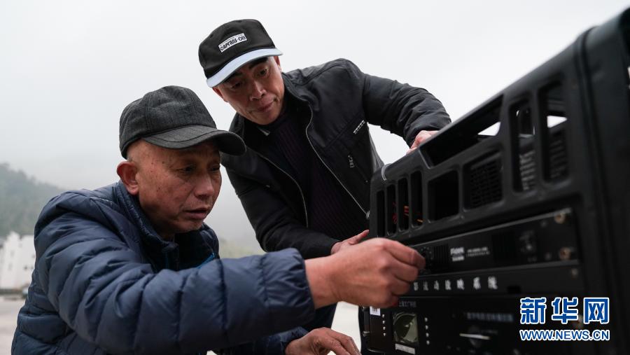 12月2日,马俊寿(左)和同事阮冬祥一起在黎川县华山镇调试电影放映机,准备播放电影。新华社记者 胡晨欢 摄