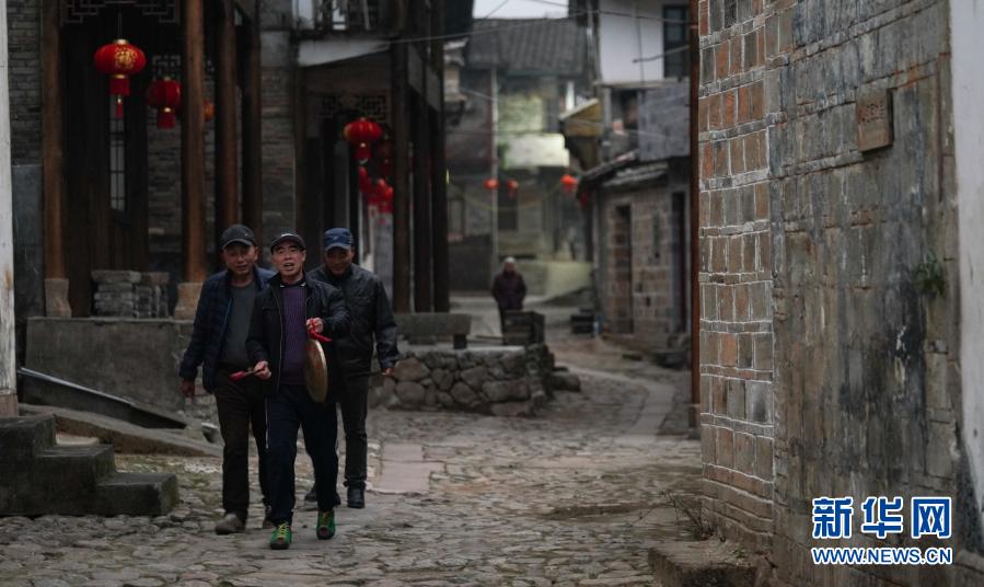 12月2日,马俊寿(左)和同事在黎川县华山镇通过敲锣的形式告知村民电影信息。新华社记者 胡晨欢 摄