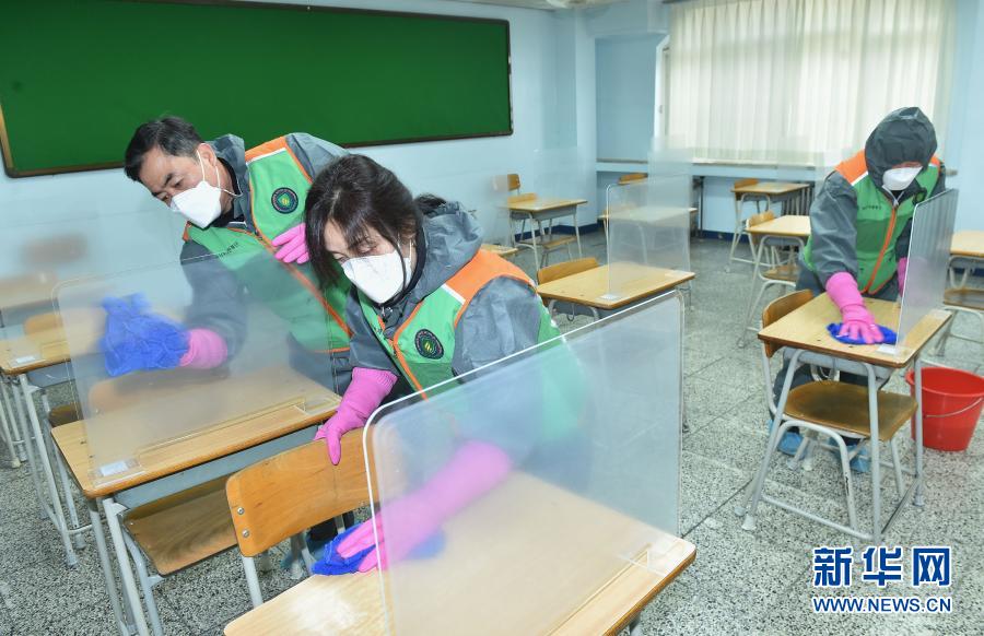 受新冠疫情影响,原定于今年11月19日举行的韩国大学修学能力考试(相当于中国的“高考”)被推迟至12月3日举行。高考前夕,韩国各地考点进行消杀等准备工作,以确保高考在安全的环境中进行。新华社发(李相浩 摄)
