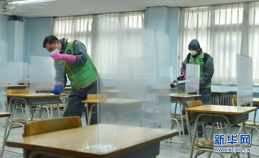 受新冠疫情影响,原定于今年11月19日举行的韩国大学修学能力考试(相当于中国的“高考”)被推迟至12月3日举行。高考前夕,韩国各地考点进行消杀等准备工作,以确保高考在安全的环境中进行。新华社发(李相浩 摄)