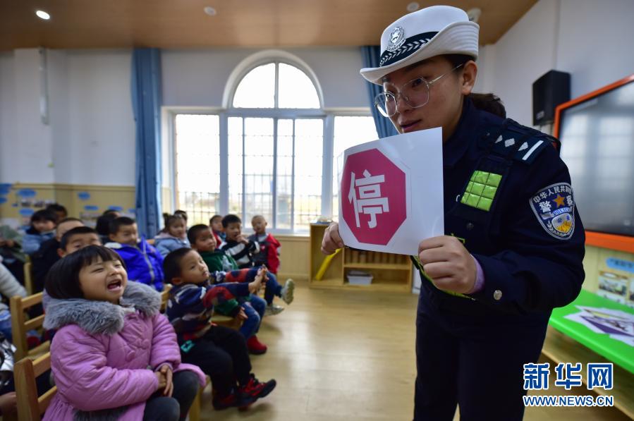 12月2日,交警在贵州省黔东南苗族侗族自治州丹寨县第二幼儿园向小朋友介绍交通安全标识。新华社发(杨武魁 摄)