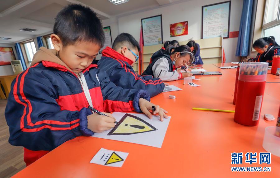 12月2日,河北唐山遵化市第二实验小学学生在绘制交通安全标识。新华社发(刘满仓 摄)