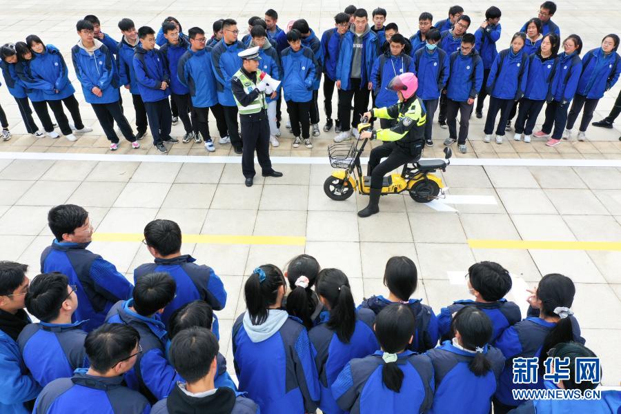 12月2日,浙江省舟山市岱山县公安局交警大队民警向岱山职业技术学校的学生们讲解电动自行车常见违法行为(无人机图片)。新华社发(邹训永 摄)