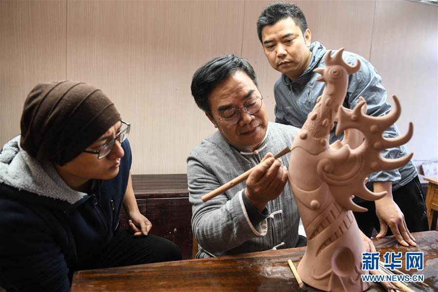 陆景平在传授坭兴陶作品图案的雕刻技巧(12月4日摄)。新华社记者 张爱林 摄