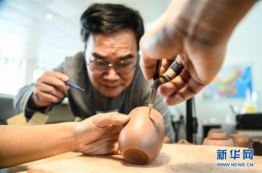这是陆景平在指导徒弟掌握绘制坭兴陶产品图案的技巧(12月4日摄)。新华社记者 张爱林 摄