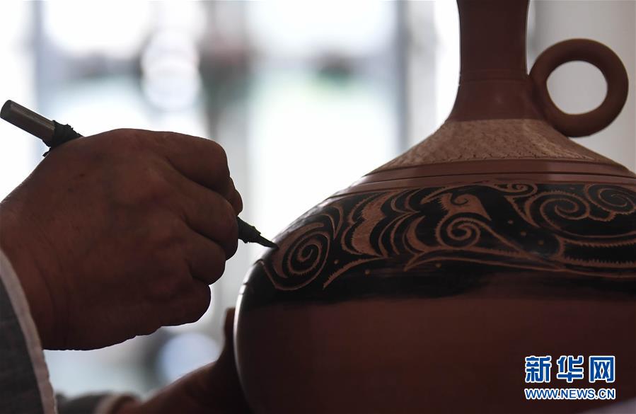 陆景平在坭兴陶半成品上雕花(11月5日摄)。新华社记者 张爱林 摄