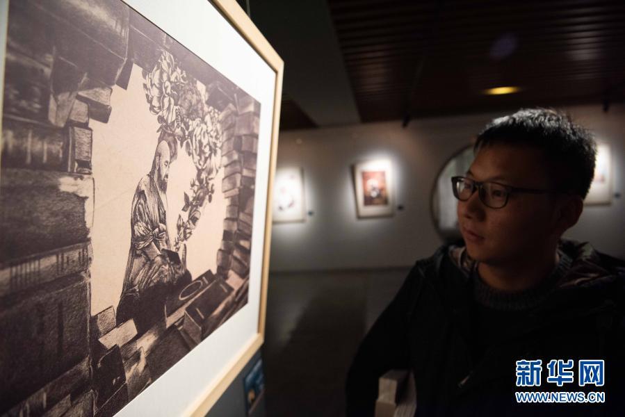 12月15日,工作人员在漫画展现场查看展品。当日,“世界的老子”国际漫画展在贵阳孔学堂完成布展,将于12月16日开展。“世界的老子”国际漫画展以老子为主题,展出来自全球40余个国家和地区艺术家的120件漫画作品。新华社记者 欧东衢 摄