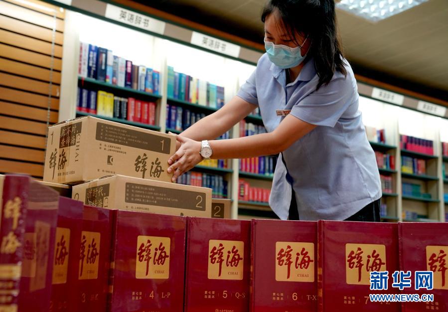 上海书城工作人员将《辞海》(第七版)摆放上架(9月10日摄)。新华社记者 刘颖 摄