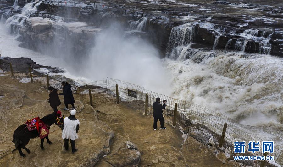 12月14日,游人在壶口瀑布景区游玩(无人机拍摄)。