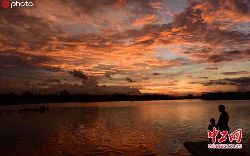 2020年7月30日,海南琼海,万泉河畔霞光艳丽。近一个月几乎滴雨全无的海南省琼海市当天下午迎来一场短时阵雨。傍晚,城区上空出现火红夕阳,将万泉河两岸点缀得分外艳丽。据气象预报,南海热带低压即将生成,海南岛将有较强风雨。