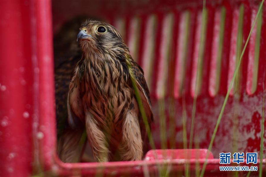 7月31日,在青海野生动物救护中心野外放归地,一只被放归的红隼雏鸟准备出笼。 新华社记者 张龙 摄