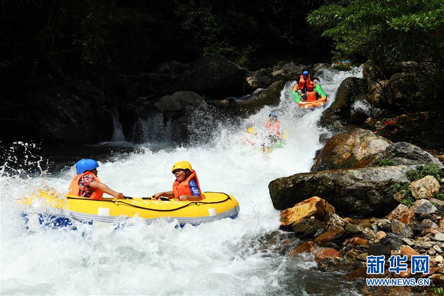 8月2日,游客在广西龙胜各族自治县龙脊峡漂流景区游玩。 新华社发(吴生斌 摄)