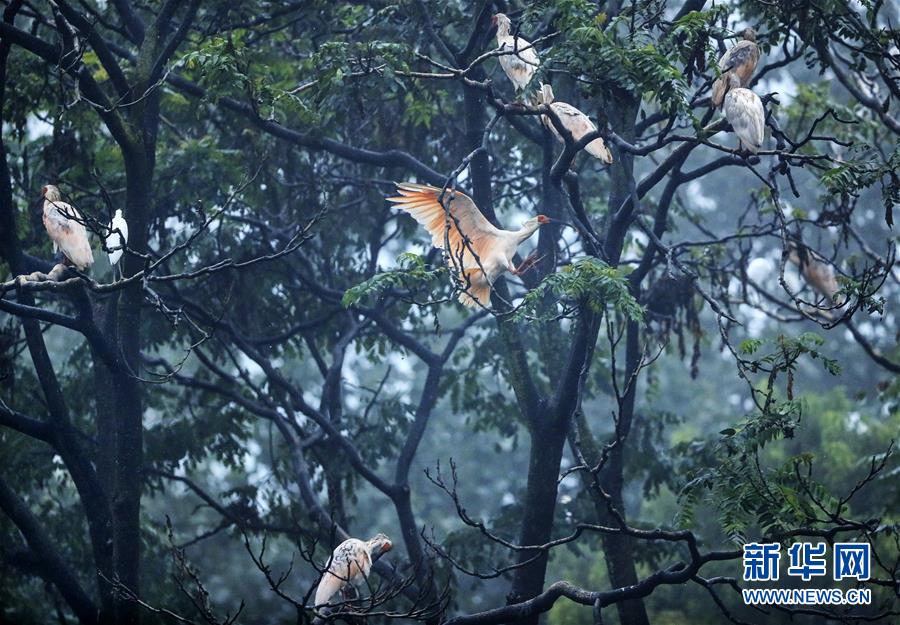 8月1日拍摄的栖息在洋县陈家村附近的朱鹮。 新华社记者兰红光摄