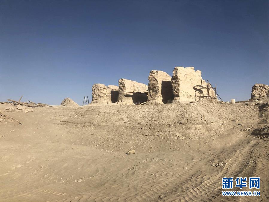 这是抢险加固中的楼兰古城三间房遗址(7月27日摄,手机照片)。 新华社发(中铁西北科学研究院有限公司提供)