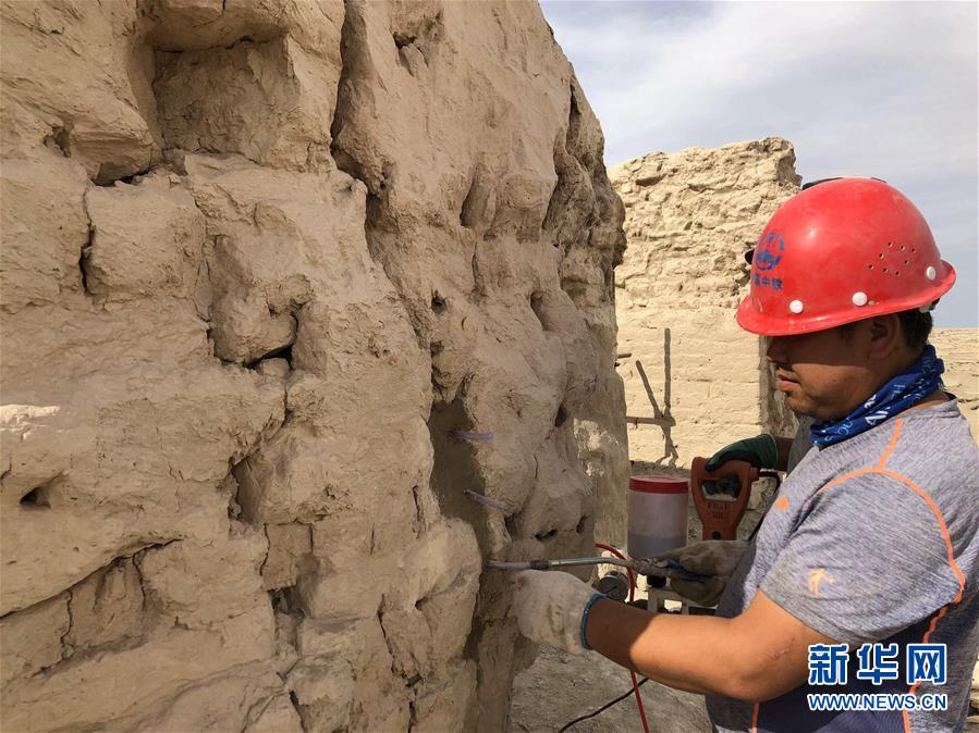 工作人员采用原土泥浆对三间房遗址的裂隙进行灌注封堵处理(7月26日摄,手机照片)。 新华社发(中铁西北科学研究院有限公司提供)
