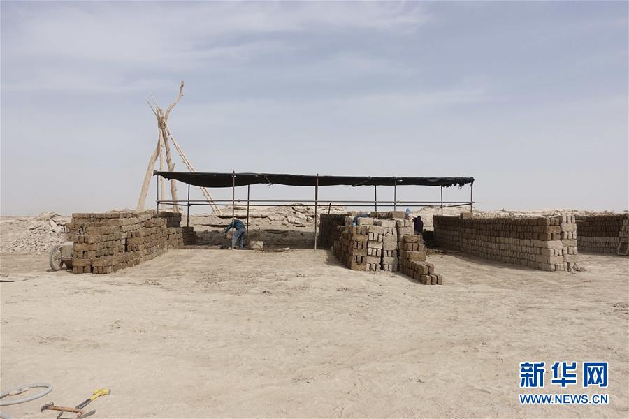 工作人员选取楼兰古城外围的土料制备土坯(7月1日摄)。 新华社发(中铁西北科学研究院有限公司提供)
