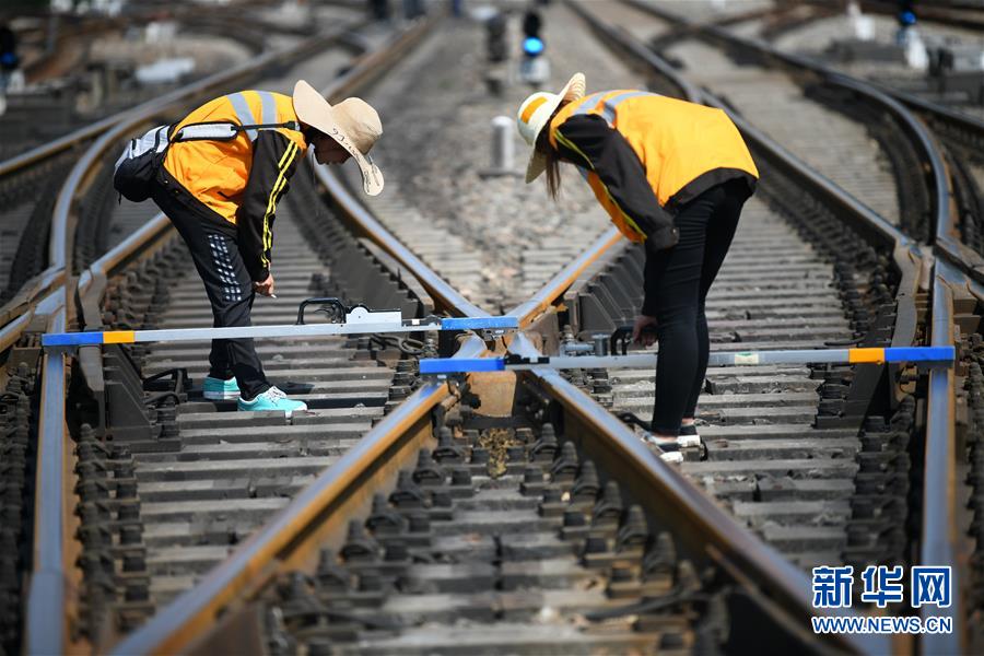8月10日,西安铁路局西安工务段咸阳线路车间检查工区“女子检查组”的姑娘在咸阳车站进行作业。 新华社记者 李一博 摄