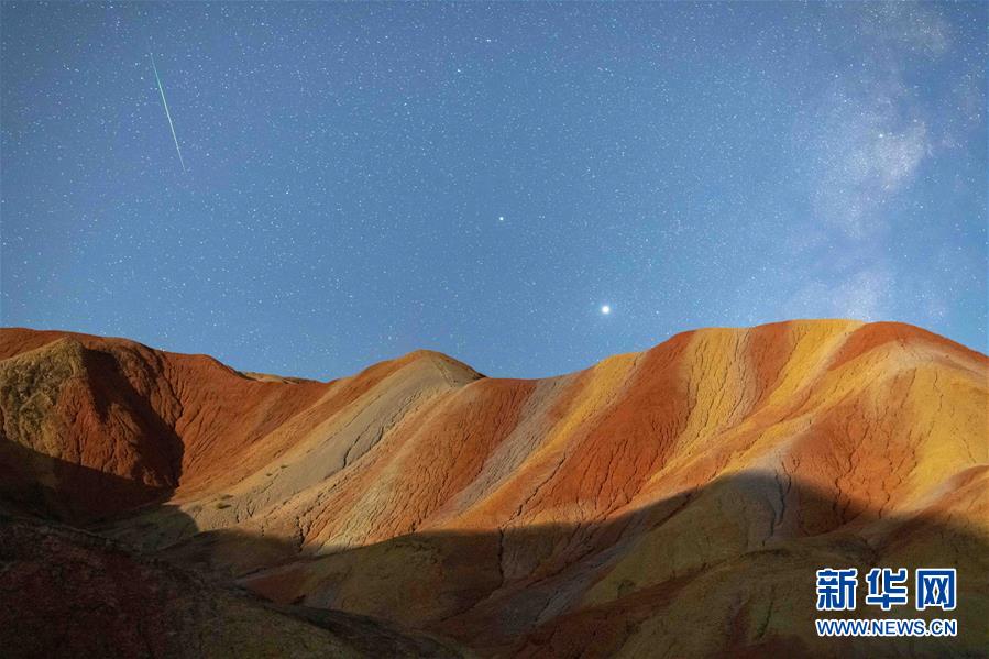 这是8月13日凌晨在甘肃省张掖七彩丹霞地质公园中拍摄的英仙座流星雨(长时间曝光照片)。新华社发(钟晓亮 摄)