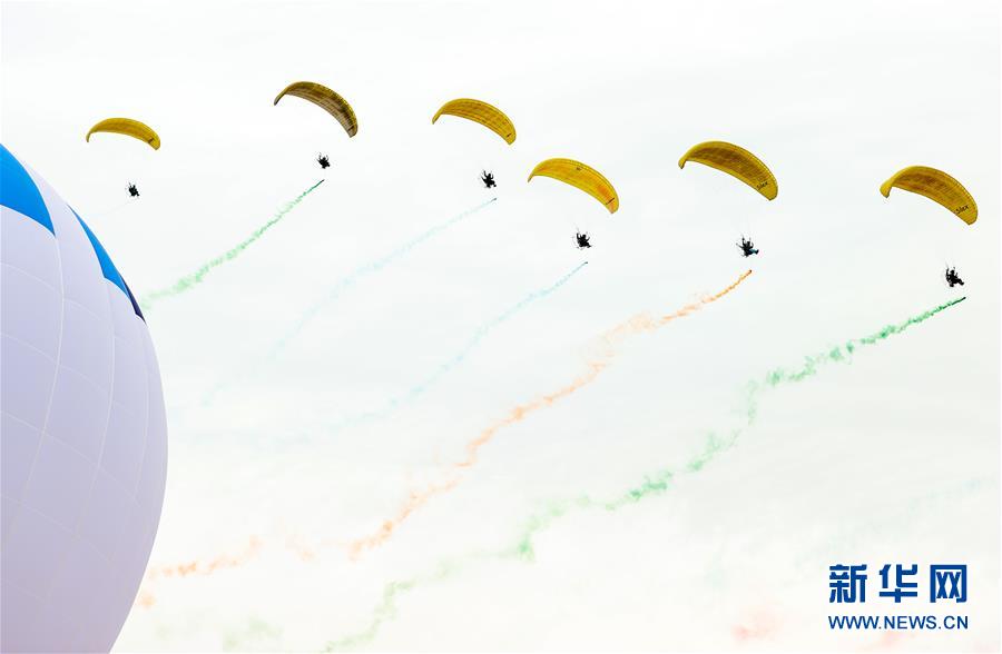 8月14日,表演者在开幕式上进行动力伞飞行表演。 当日,宁夏吴忠市盐池县举行2020年“航空嘉年华”系列活动,开幕式活动现场有动力伞、旋翼机、动力三角翼等飞行表演,让观众领略航空运动的魅力。 新华社记者 杨植森 摄