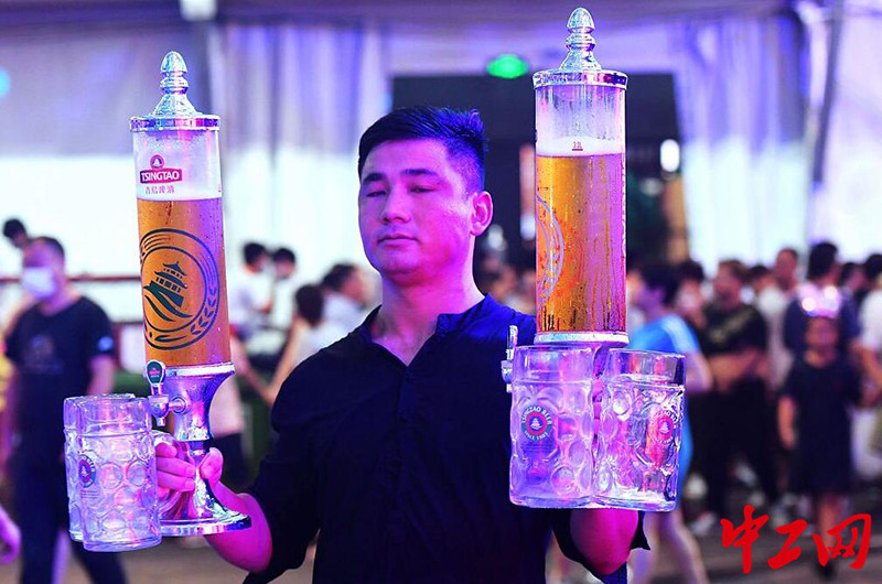 2020年8月16日,山东青岛西海岸新区金沙滩啤酒城,一位顾客从服务台买回啤酒。(俞方平/视觉中国)