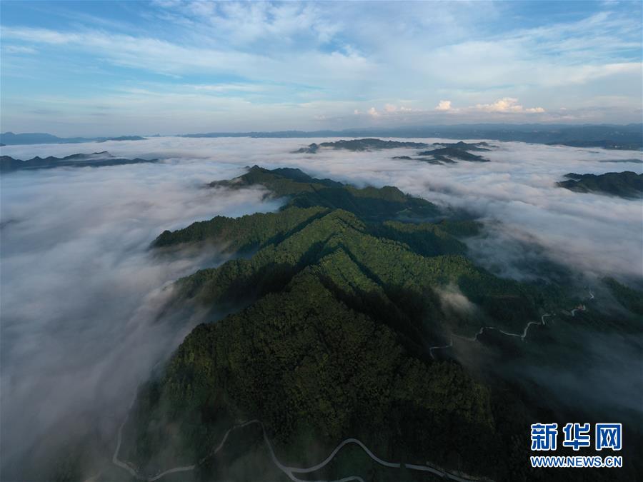 这是8月19日在利川市毛坝镇楠木村拍摄的云海(无人机照片)。 雨后初晴,湖北省恩施土家族苗族自治州利川市毛坝镇楠木村云海涌动,山峰、森林和村庄在云海中若隐若现,美若画卷。 新华社发(杨顺丕 摄)