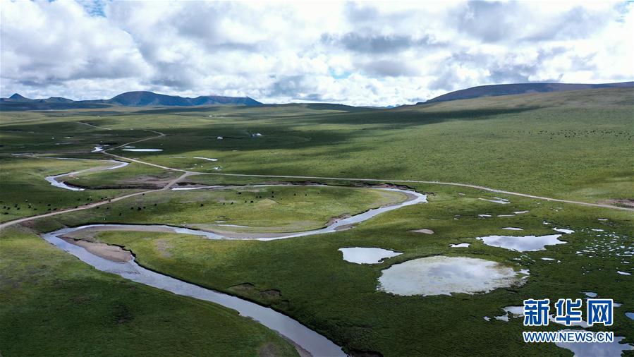 这是8月14日拍摄的长江南源当曲河道(无人机照片)。 位于青藏高原腹地昆仑山脉和唐古拉山脉之间的长江源地区,蜿蜒曲折的河道在草场间流淌,与远山相互映衬,形成一幅壮美的画卷。 新华社记者 吴刚 摄