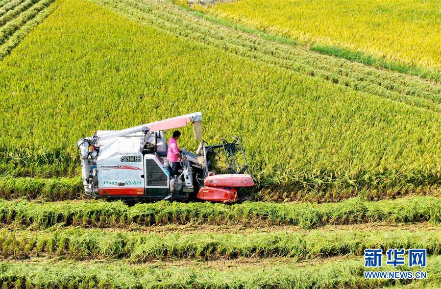 8月21日,在广安市岳池县顾县镇骑龙庙村,农民驾驶收割机收割水稻。 近日,四川省广安市水稻相继成熟,当地农民抢抓晴好天气,奔忙田间,收割水稻。 新华社发(邱海鹰 摄)