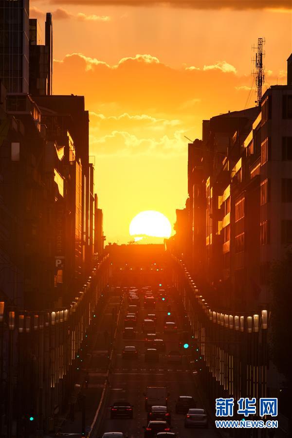 这是8月21日在比利时首都布鲁塞尔拍摄的落日景观。 当日,夕阳从布鲁塞尔法律大街上空缓缓下落,形成独特的落日景观。 新华社记者 张铖 摄
