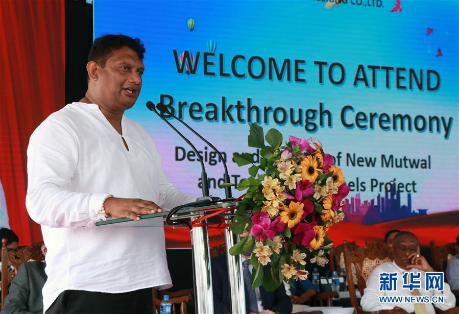 8月21日,在斯里兰卡首都科伦坡,斯里兰卡城市发展部国务部长戈德赫瓦在新穆特瓦尔工程盾构隧道全线贯通庆祝仪式上讲话。 由中国企业承建的科伦坡北部地下排水项目新穆特瓦尔工程盾构隧道21日全线贯通。 新华社发(阿吉特·佩雷拉摄)