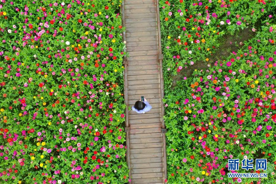 8月21日,游客在河南省洛阳市栾川县三川镇大红村观赏百日草花海(无人机照片)。 近日,河南省洛阳市栾川县三川镇大红村的200余亩百日草竞相开放,五彩缤纷的高山花海吸引游客纷纷前来游览观赏。 新华社记者 冯大鹏 摄