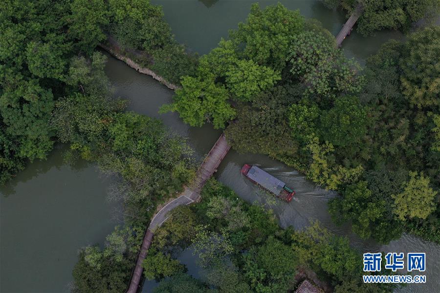 8月22日,游览电瓶船在西溪湿地公园内穿行(无人机照片)。 在被称为“人间天堂”的杭州,西溪国家湿地公园仿佛一颗绿色宝石镶嵌在城市西边。杭州西溪国家湿地公园是罕见的城中次生湿地、中国首个国家湿地公园,集城市湿地、农耕湿地、文化湿地于一体,有“天堂绿肺”之称,具有涵养水源、净化水质、调蓄洪水、美化环境、调节气候等生态功能。 新华社记者 黄宗治 摄