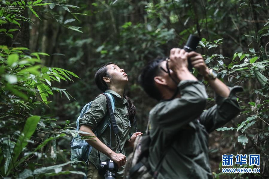 调查人员在海南白沙县的热带雨林中观测、拍摄海南长臂猿(2019年10月25日摄)。新华社记者 蒲晓旭 摄