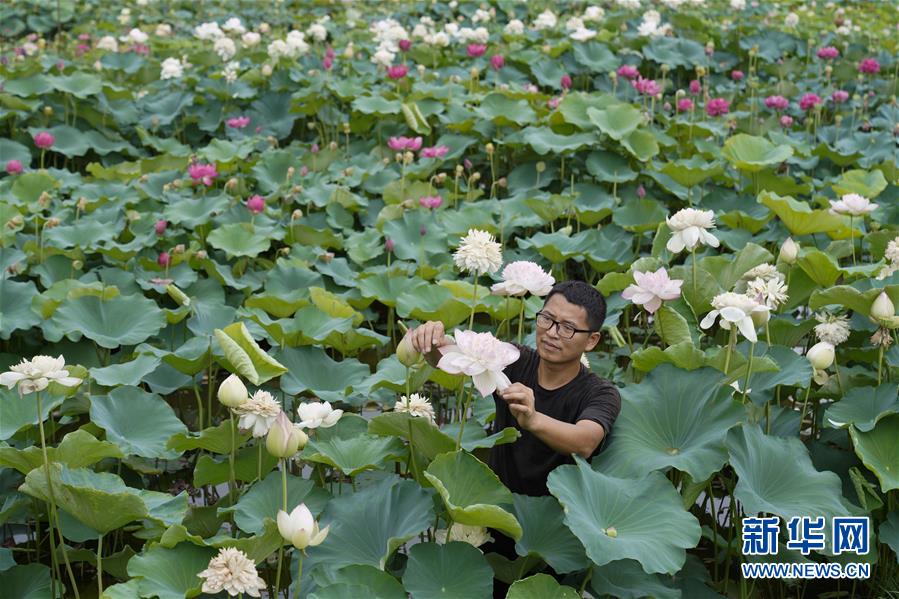 8月24日,在重庆市北碚区静观镇双塘村,尹学颖在查看荷花。 在重庆市北碚区静观镇双塘村,有位爱花之人扎根荷田,通过种植观赏荷花,售卖荷花相关产品创业。这位创业者名叫尹学颖,今年38岁,毕业于重庆大学。从2018年开始,尹学颖在静观镇双塘村种植观赏性荷花,他刻苦钻研荷花培育技术,目前已种植了数十种荷花,并开设网店出售种藕、鲜切花、荷花盆栽、莲子等产品,产品远销山东、广州、福建、江苏等地。 尹学颖表示,希望能利用自己的特长,在荷花特色种植及相关产品领域拓宽销售渠道,带动周边村民增收致富。 新华社发(秦廷富 摄)