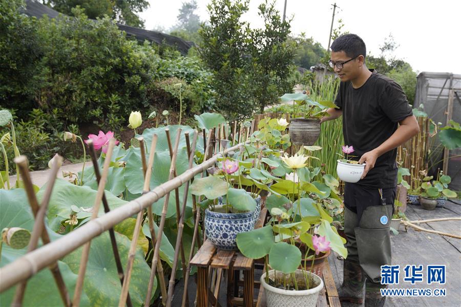 8月24日,在重庆市北碚区静观镇双塘村,尹学颖在布置盆栽观赏性荷花展台。 新华社发(秦廷富 摄)