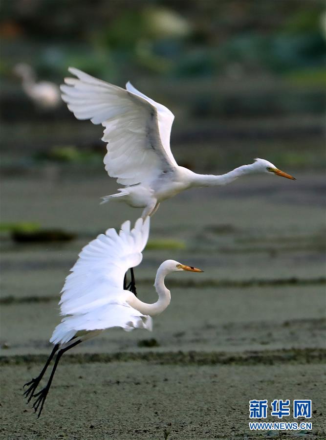 8月24日,在江苏省盱眙县马坝镇,白鹭在一处湿地上飞舞、觅食。 新华社发(颜怀峰 摄)