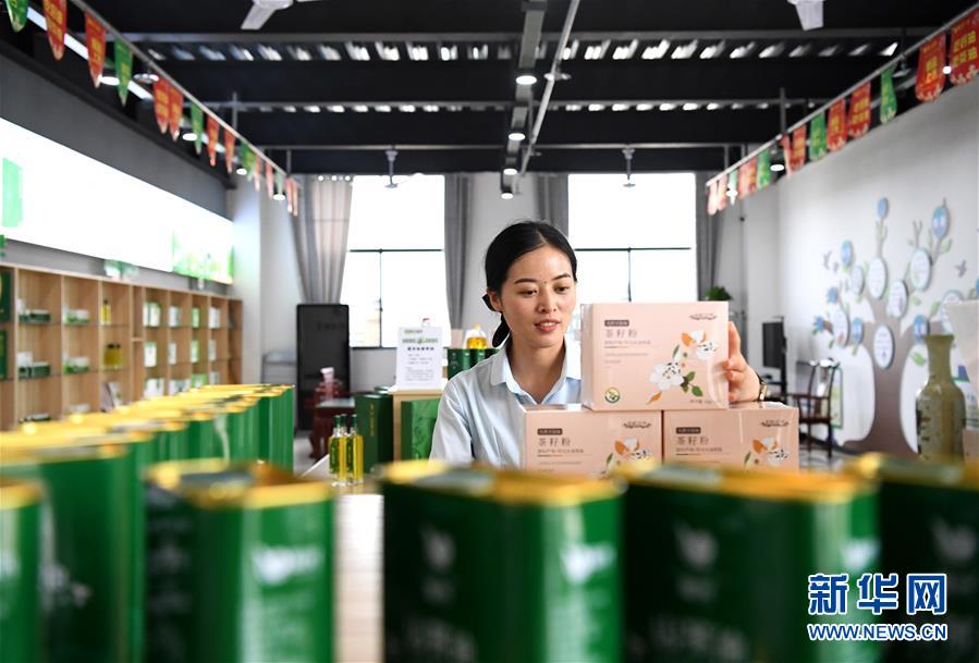 8月25日,工作人员在河南省光山县一家油茶加工企业展厅内整理产品。 新华社记者 郝源 摄