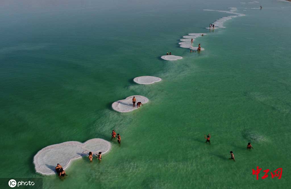 无人机俯瞰民众漫步死海神奇“盐层”
