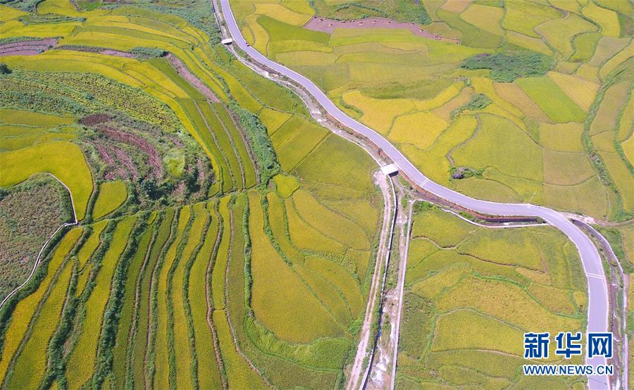 8月26日拍摄的湖南省花垣县麻栗场镇沙科村的稻田景色(无人机照片)。 新华社发(龙恩泽 摄)