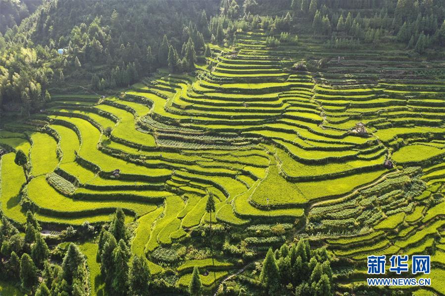 8月26日拍摄的浙江景宁畲族自治县郑坑乡吴布村稻田景色(无人机照片)。新华社发(李肃人 摄)
