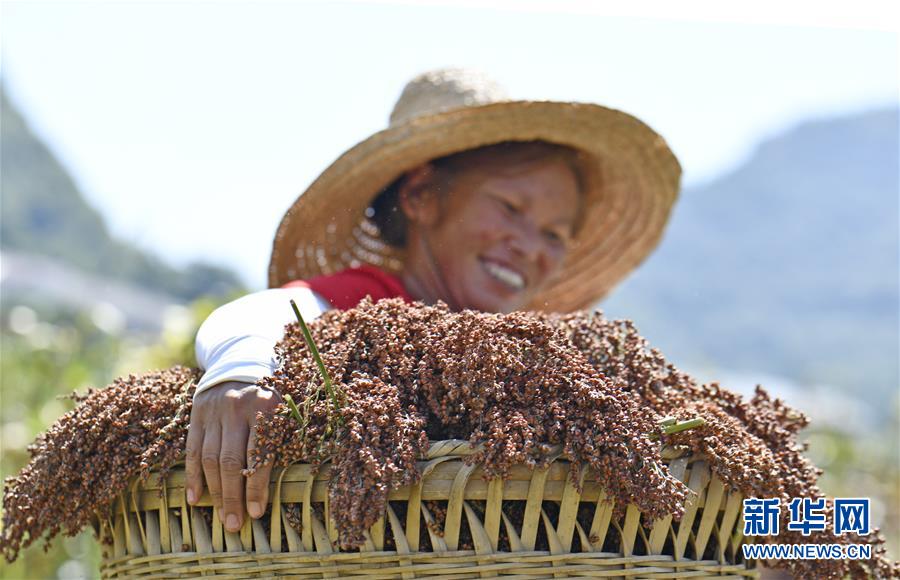 8月26日,贵州省遵义市汇川区团泽镇团泽居村民在地里收割高粱。 新华社发(罗星汉 摄)