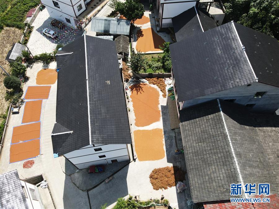 8月26日拍摄的贵州省遵义市汇川区团泽镇团泽居村民晾晒的高粱(无人机拍摄)。 新华社发(罗星汉 摄)