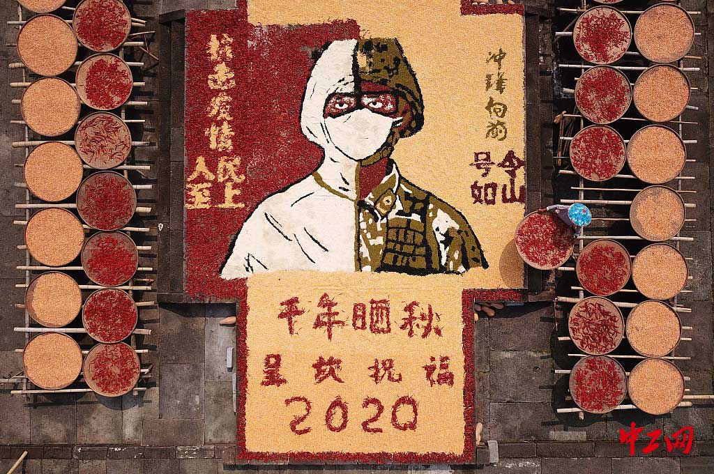 2020年8月27日,安徽省黄山市呈坎古村,村民利用晴好天气,将收获归仓的玉米、黄豆、南瓜和红辣椒等五彩缤纷的果实,因地制宜晾晒在村中晒场,创意地拼出“国泰民安、风调雨顺”字样及战士、医护卡通形象,以农家特有的方式向祖国表达美好祝愿,向“最美逆行者”致敬。( 施亚磊/人民视觉 )