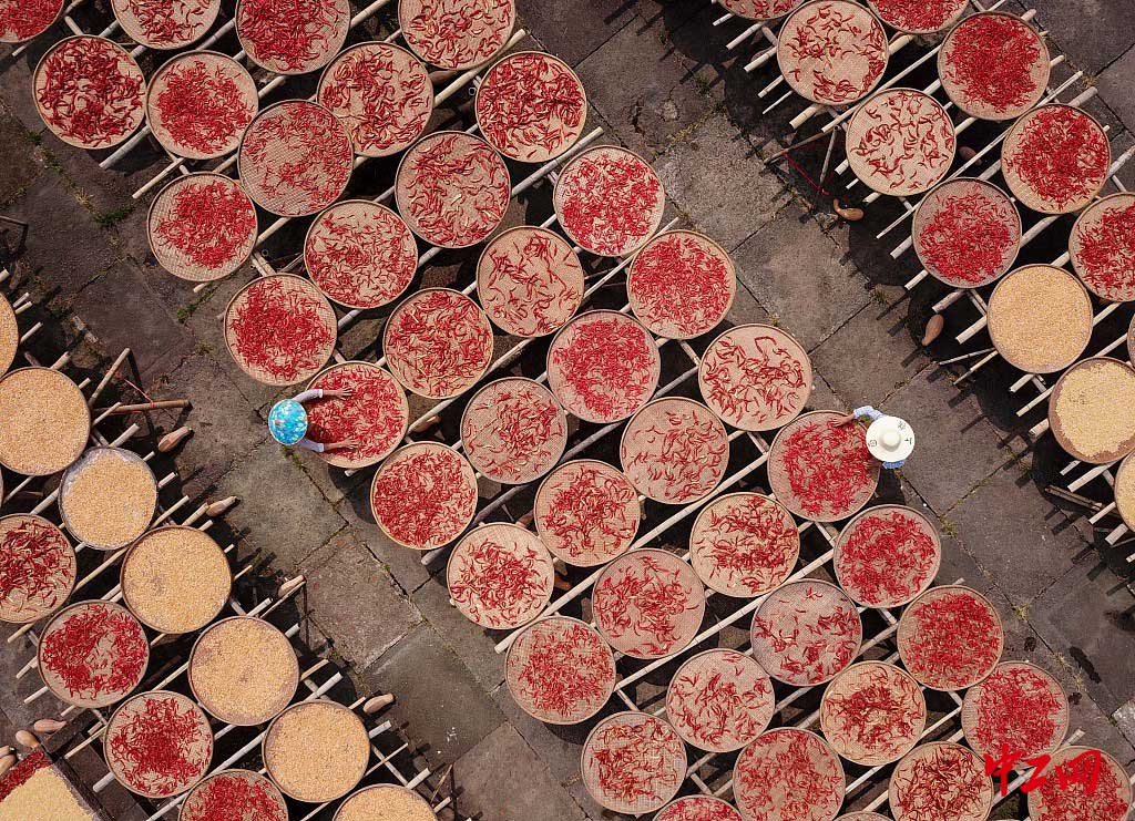 2020年8月27日,安徽省黄山市呈坎古村,村民利用晴好天气,将收获归仓的玉米、黄豆、南瓜和红辣椒等五彩缤纷的果实,因地制宜晾晒在村中晒场,创意地拼出“国泰民安、风调雨顺”字样及战士、医护卡通形象,以农家特有的方式向祖国表达美好祝愿,向“最美逆行者”致敬。( 施亚磊/人民视觉 )