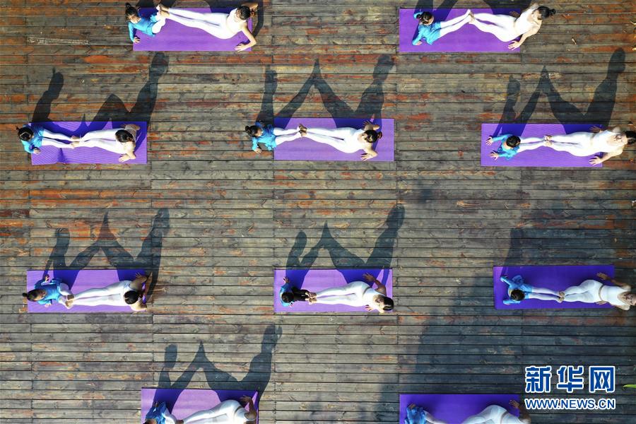 8月30日,瑜伽爱好者们在进行瑜伽展示(无人机照片)。 8月30日,贵州省黔东南苗族侗族自治州剑河县的瑜伽爱好者们来到剑河温泉景区参加瑜伽展示活动。 新华社记者杨文斌摄