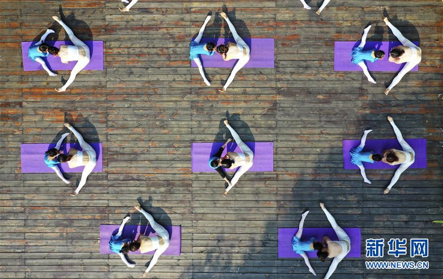 8月30日,瑜伽爱好者们在进行瑜伽展示(无人机照片)。 8月30日,贵州省黔东南苗族侗族自治州剑河县的瑜伽爱好者们来到剑河温泉景区参加瑜伽展示活动。 新华社记者杨文斌摄