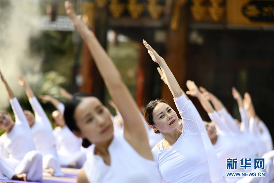 8月30日,瑜伽爱好者们在进行瑜伽展示。 8月30日,贵州省黔东南苗族侗族自治州剑河县的瑜伽爱好者们来到剑河温泉景区参加瑜伽展示活动。 新华社记者杨文斌摄