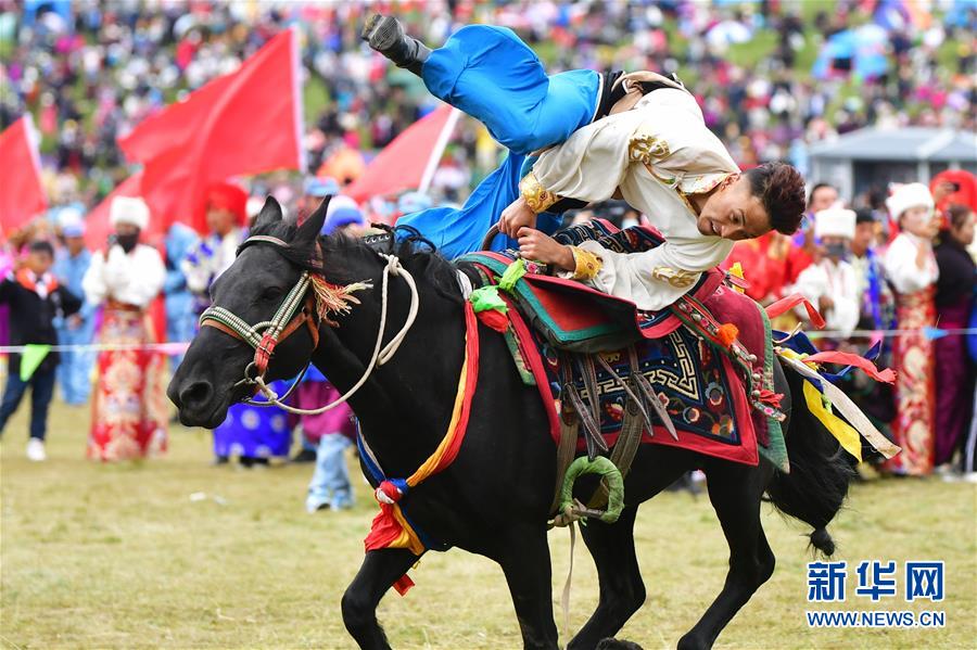 8月31日,藏族骑手在当周草原上表演马术。新华社记者 陈斌 摄