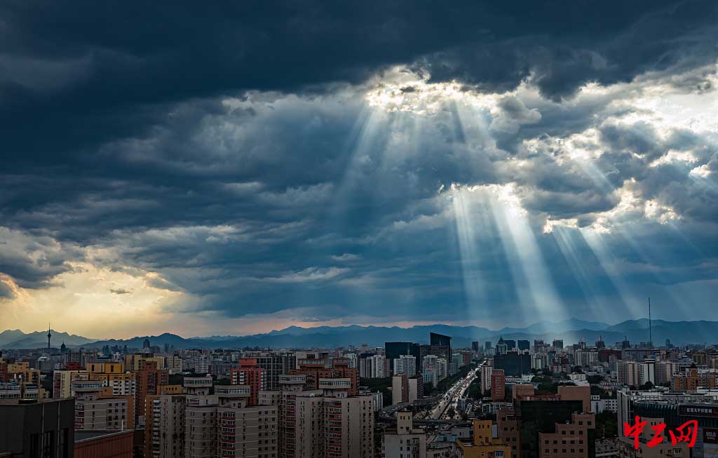2020年9月1日下午,北京,阳光从雨后的云隙中射出,光影效果宛若太空题材的科幻大片。图为光线照在门头沟定都阁上。(余明/视觉中国 )