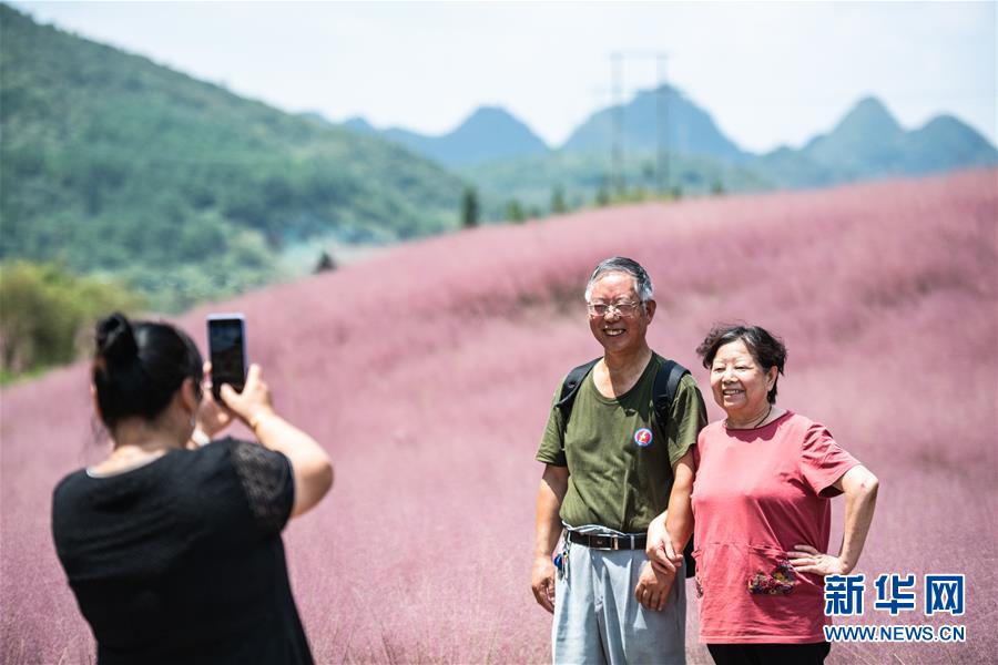 9月2日,游客在长顺县神泉谷景区内拍照留念。 近日,贵州省黔南布依族苗族自治州长顺县神泉谷景区内的粉黛乱子草进入盛开期,成片的“粉色海洋”吸引众多游客前来观赏游玩。 新华社记者 陶亮 摄